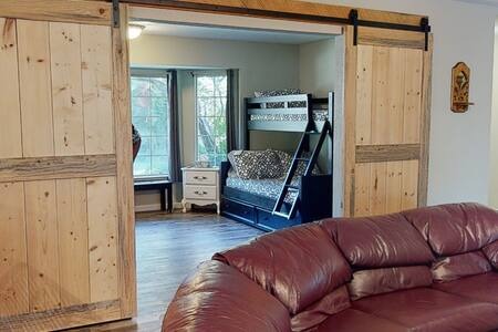 Back down the hall, through the barn doors on your right, you’ll find the bunk room with 5 beds, 2 full and 4 twin. This room is perfect for kids or groups traveling together. Walk through the family room to the kitchen and dining area with an island and a bar. Through the door between the dining area and the kitchen, you’ll discover a separate one-bedroom apartment with a full kitchen, a couch, chairs, and a dining area in the common area, a queen bed in the bedroom, and a private bathroom.