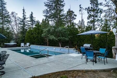 Unwind in the outdoor haven featuring comfortable seating, a propane firepit, and year-round pool access. The backyard offers both in-ground and above-ground hot tubs. Using the in-ground spa incurs a $100/day charge during winter.