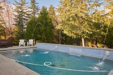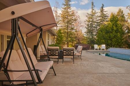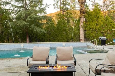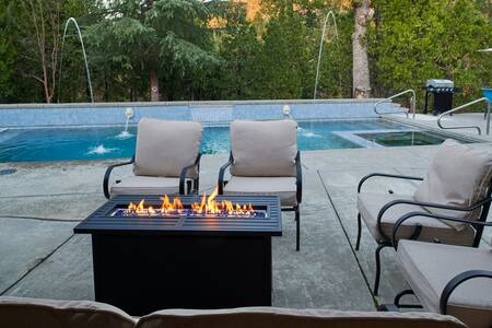 Unwind in the outdoor haven featuring comfortable seating, a propane firepit, and year-round pool access. The backyard offers both in-ground and above-ground hot tubs. Using the in-ground spa incurs a $100/day charge during winter.