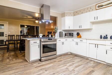 The dining area in the house seats 12 guests, but feel free to host an outdoor dining or BBQ party in your own backyard patio lounge area with a fire pit, BBQ, and HOT TUB!