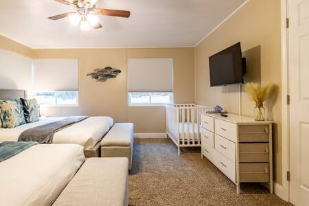 BR2: 2 king-sized beds, full bathroom, crib, and a 40″ TV.
