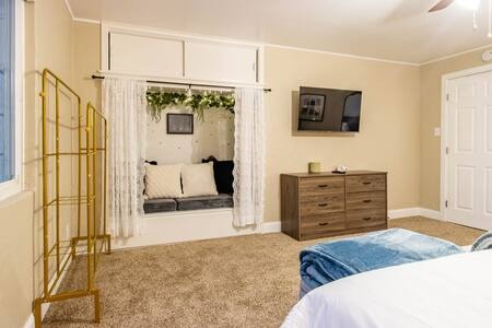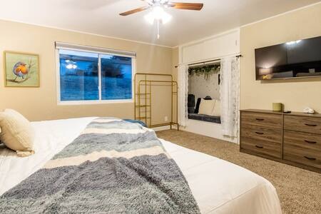 BR1: ULTRA king-sized bed, starry night theme nook, and a 40″ TV.