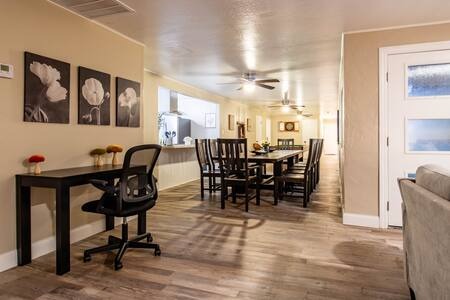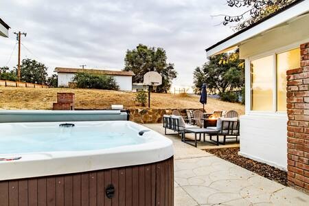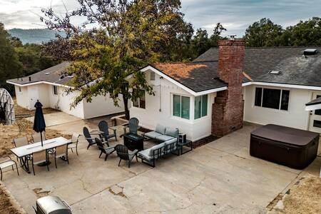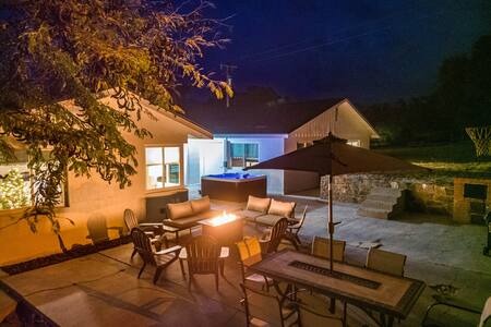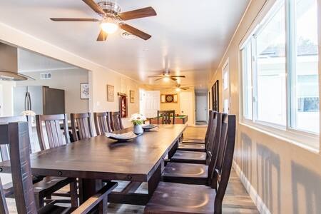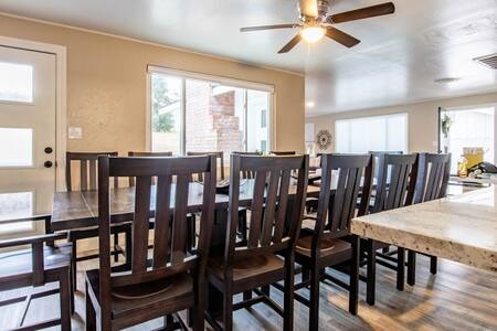 The dining area in the house seats 12 guests, but feel free to host an outdoor dining or BBQ party in your own backyard patio lounge area with a fire pit, BBQ, and HOT TUB!